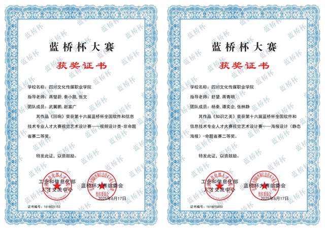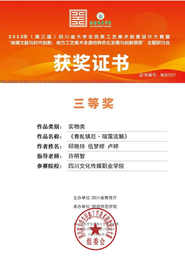 由四川省教育厅主办,四川阿坝师范学院承办,阿坝州文化馆(阿坝州非遗中心)联合承办的2025年(第三届)四川省大学生民族工艺美术创意设计大赛,我校参赛团队荣获二等奖1项、三等奖10项。