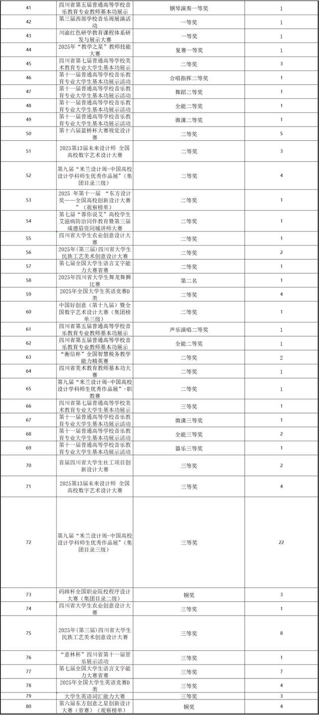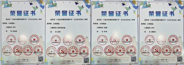 由共青团四川省委、共青团重庆市委、重庆市文化和旅游发展委员会、四川省文化和旅游厅等多部门联合举办的第二届"川渝共青春"艺术活动中我校共斩获一等奖3项、二等奖4项、三等奖7项、优秀奖8项。