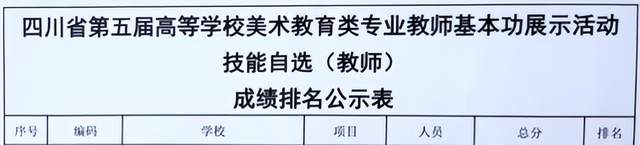 在四川省教育厅主办的四川省第五届高等学校美术教育专业教师基本功展示暨四川省第七届高校美术教育专业大学生基本功展示活动中,我校荣获一等奖2项,二等奖4项,三等奖2项。
