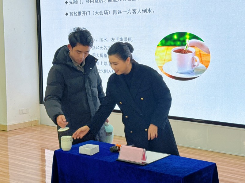 本次培训特邀文旅与经贸学院杜文君老师主讲。杜文君老师围绕职业形象、接待流程、沟通技巧、座次安排及应急处理等内容进行了系统讲解与示范,参训人员实操,现场互动积极。