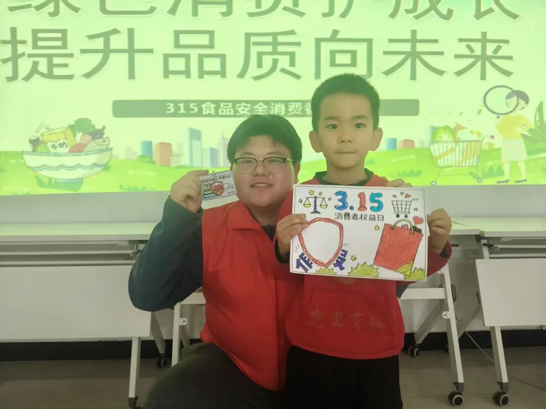 活动现场,志愿者们以理论科普结合沉浸式互动打造四大特色教学环节。“食品安全小课堂”结合动画与实景案例,讲解食品安全常识,教孩子辨别“三无”、过期变质食品;“消费误区大揭秘”通过情景模拟、案例对比,揭露消费隐患,提醒孩子关注食品关键信息、拒绝盲目跟风;“维权小先锋”以趣味故事讲解消费者权利,告知孩子们遇到消费侵权问题时,可通过 12315 热线、向家长和市场监管部门求助等方式维护自身合法权益,鼓励孩子们争做懂法、守法、用法的小小维权先锋。最后结合主题进行绘画创作,孩子们用画笔描绘守护消费安全的场景,在童趣创作中深化对安全消费的理解。