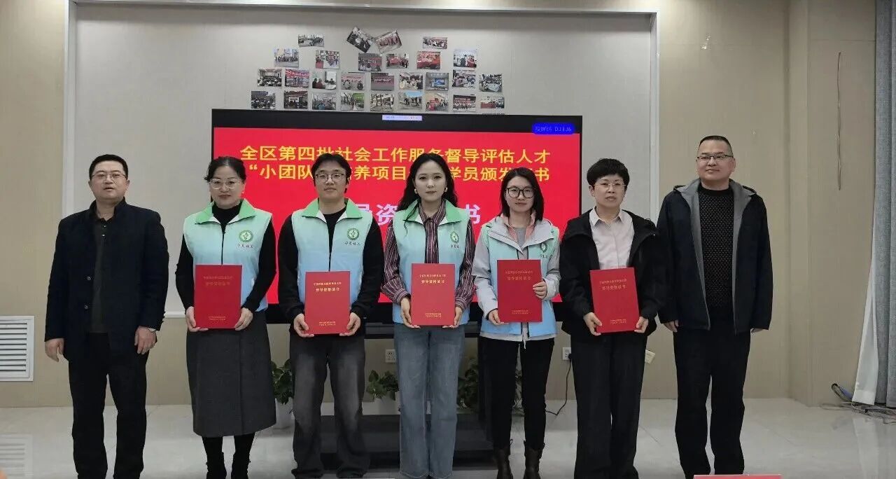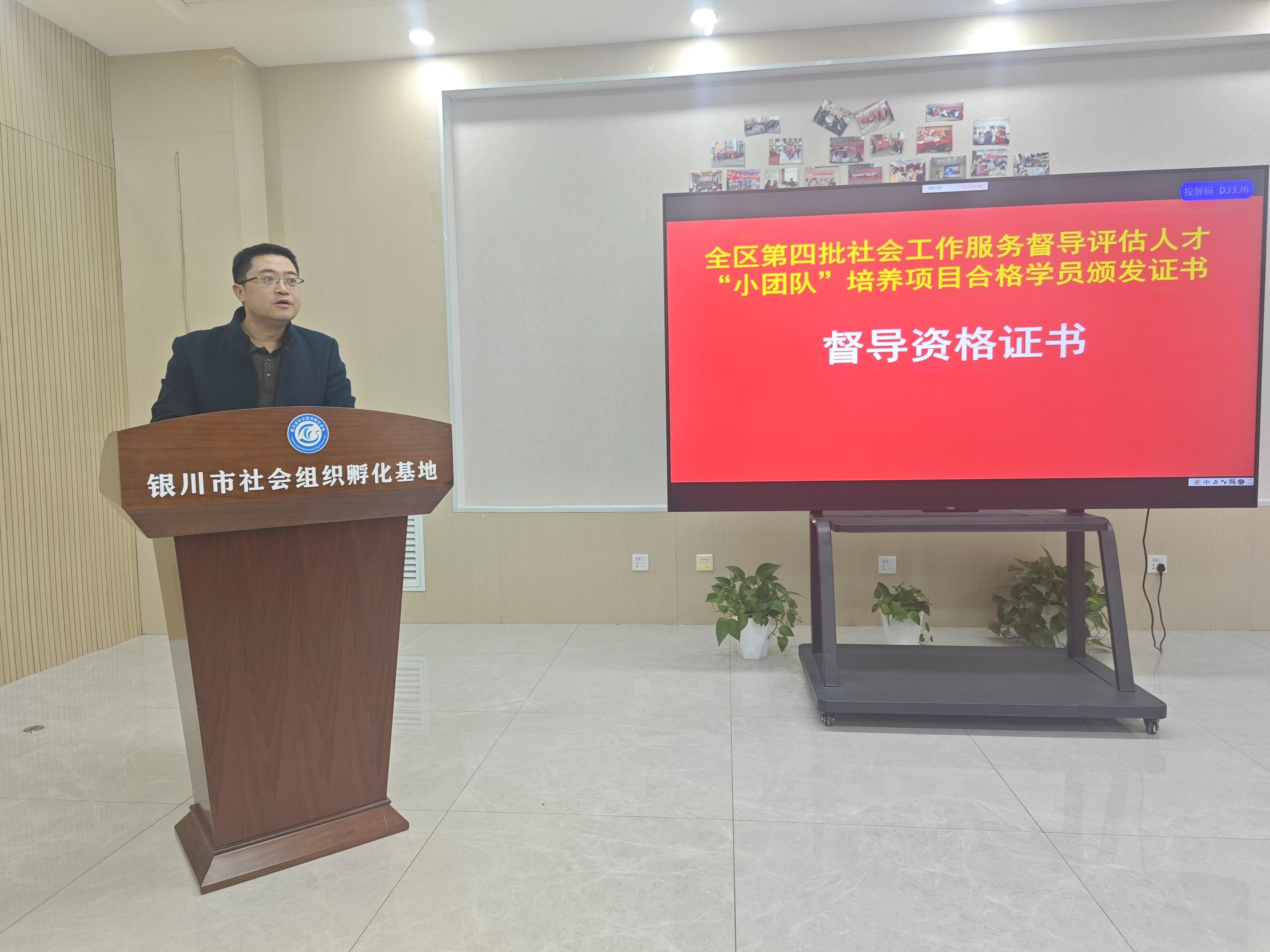 活动现场,自治区党委社会工作部有关负责同志传达学习了中共中央办公厅、国务院办公厅印发的《关于推进社会工作专业人员队伍建设的意见》;宁夏社工联合会有关负责同志对项目实施情况、培养成效及学员考核进行全面回顾;宁夏社会工作联合会副会长马麟宣读了《全区第四批社会工作服务督导评估人才“小团队”培养计划》合格学员、优秀学员名单,与会领导为结业学员颁发了证书。马麟结合当前社会工作专业发展形势做了交流发言,强调了社会工作专业人才队伍建设的重要意义,既肯定了学院人才培养取得的成效,也表示将进一步发挥专业优势,为宁夏社会工作高质量发展贡献银能力量。