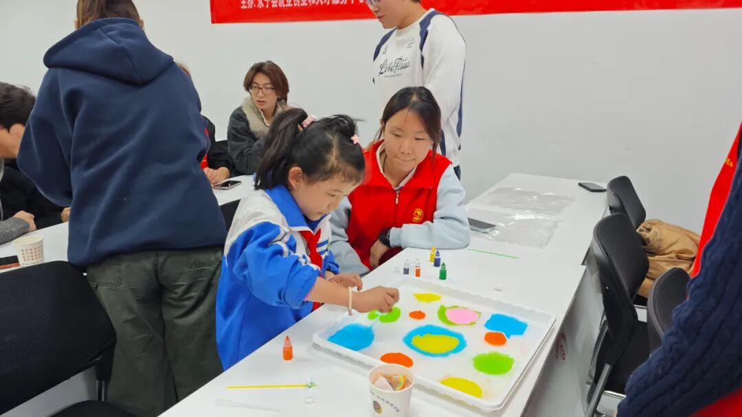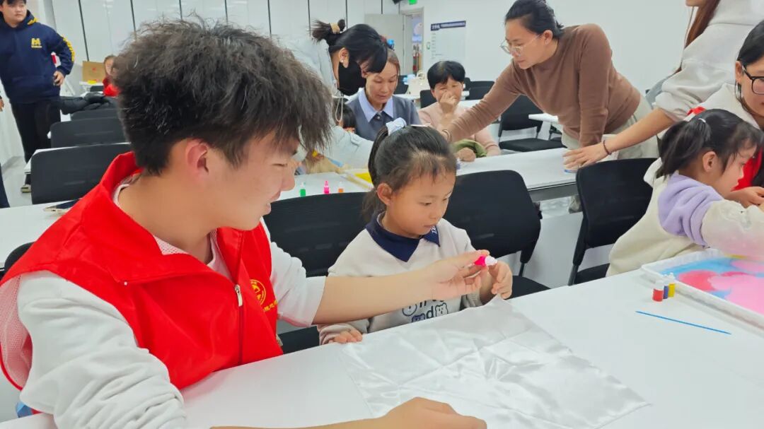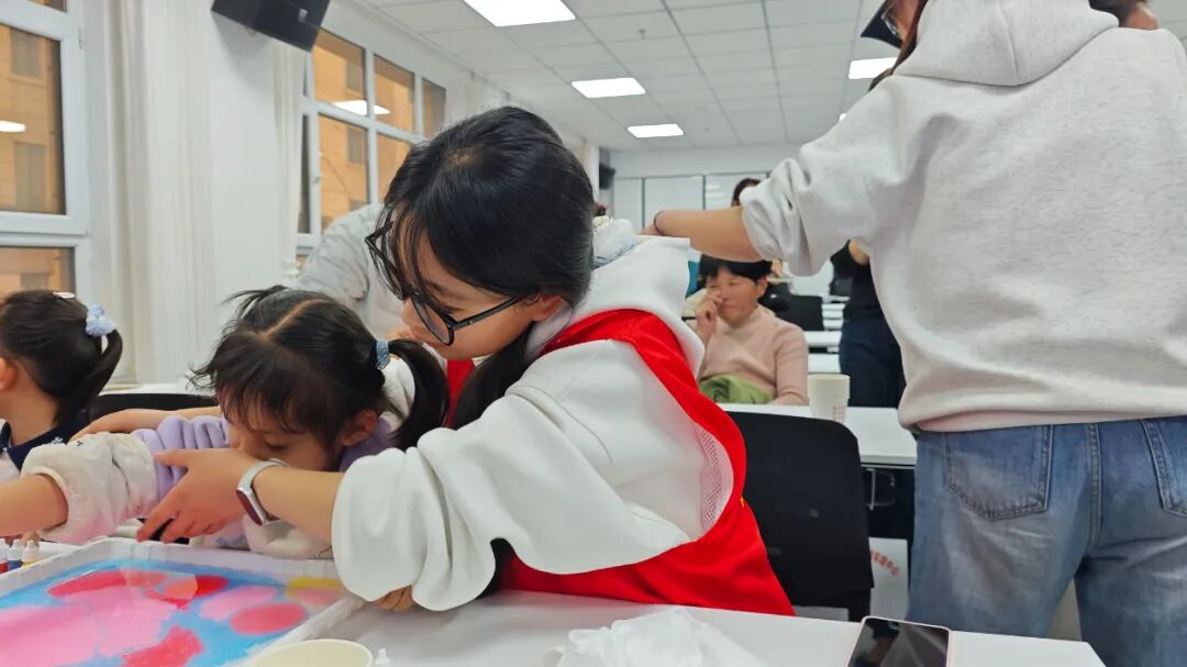 活动现场,志愿者们通过生动有趣的PPT,向小朋友们详细讲解了植树节的由来,深入普及黄河流域生态保护的重要意义。随后,水拓丝巾手工体验环节顺利开展,志愿者们一对一耐心指导,帮助孩子们调配颜料、构思图案、拓印定型,孩子们兴致盎然地大胆创作,在沉浸式体验传统技艺魅力的同时,将生态保护理念深深根植于心。