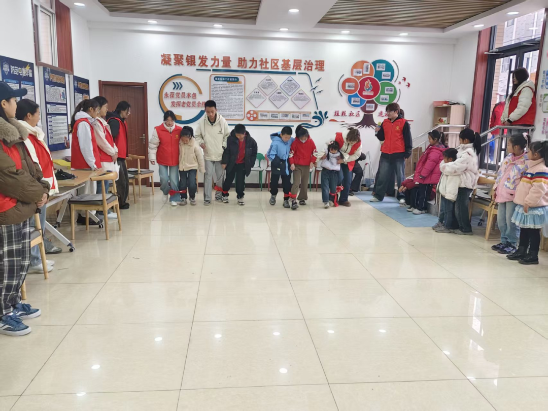 知识分享过后,志愿者们带领孩子们开展了两人三足等趣味团建游戏。红绸带系住的是脚步,更是彼此的信任与默契,“一二一,加油!”孩子们与志愿者并肩前行,在欢声笑语中感受团队协作的力量,现场充满了加油声与喝彩声,让整个社区都洋溢着青春的活力与朝气。