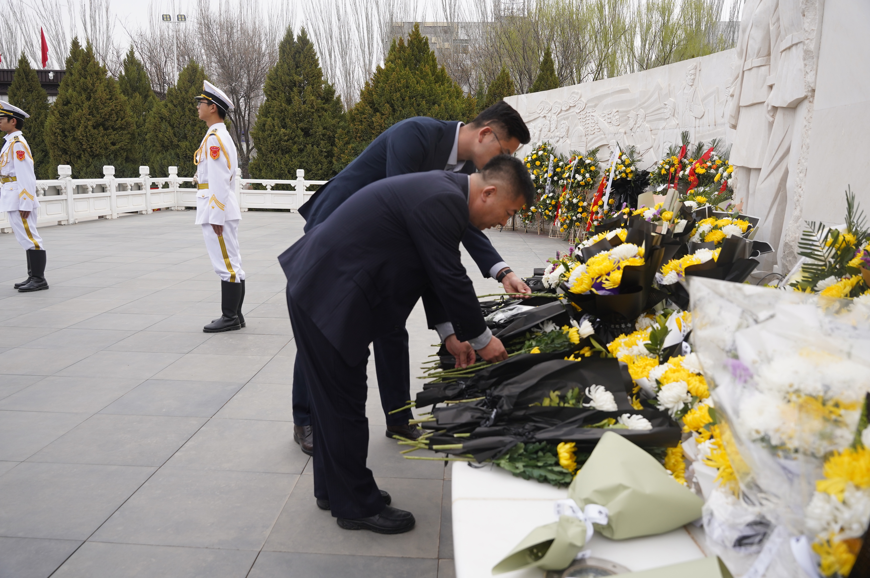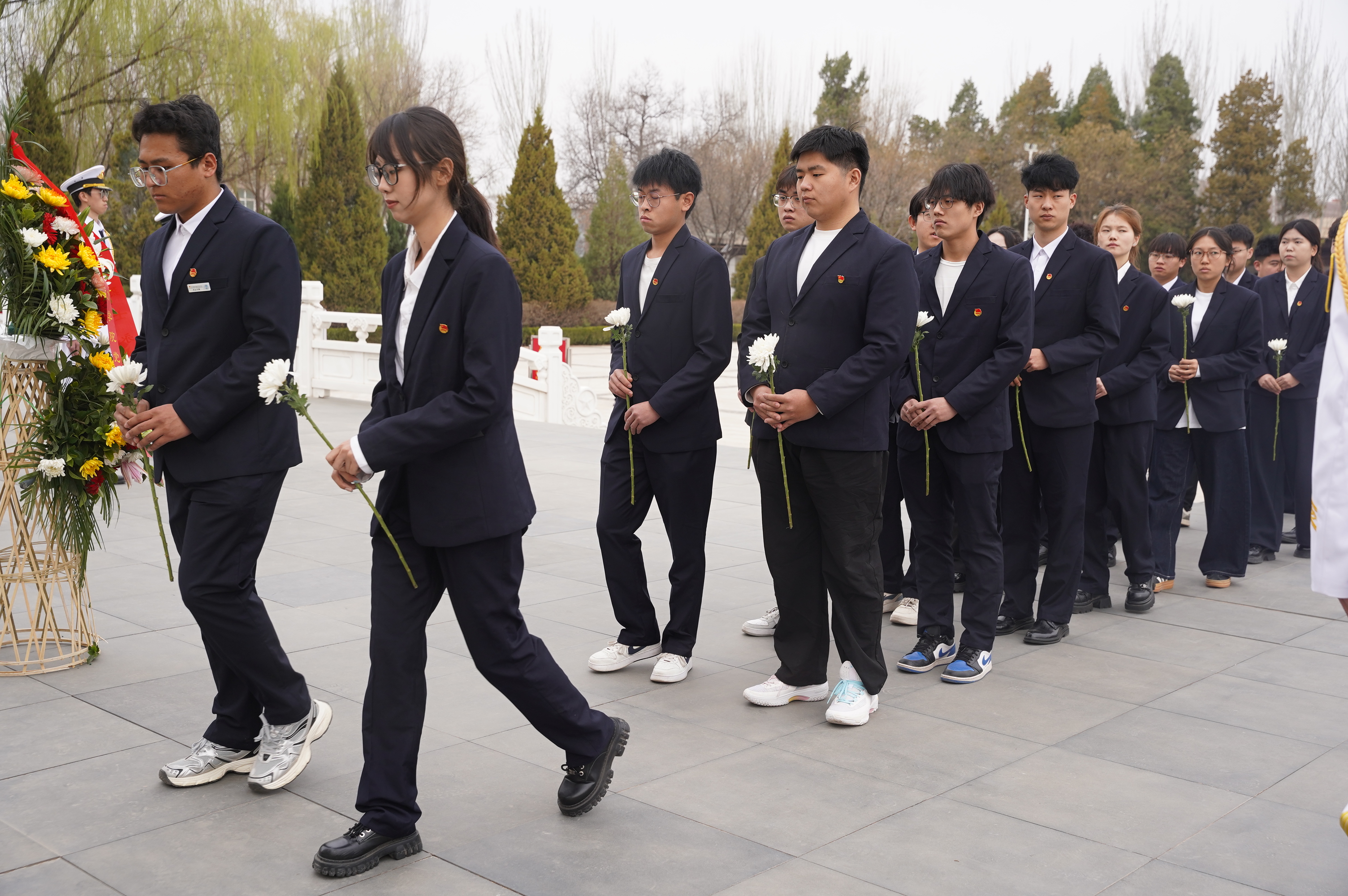 苍松凝翠,哀思悠悠;丰碑矗立,英魂永铸。在庄严肃穆的革命烈士纪念碑前,全体师生列队肃立,齐声高唱《义勇军进行曲》,激昂雄壮的旋律回荡陵园,饱含着对革命先烈的无限崇敬与深切缅怀。默哀环节,全体人员垂首静立,在静默中追思英烈事迹,寄托哀思之情。国旗护卫队队员迈着铿锵稳健的步伐,手抬花篮缓步走向烈士纪念碑,珍重将花篮敬献与碑前,承载着全体师生对先烈的无限追思与崇高敬意。