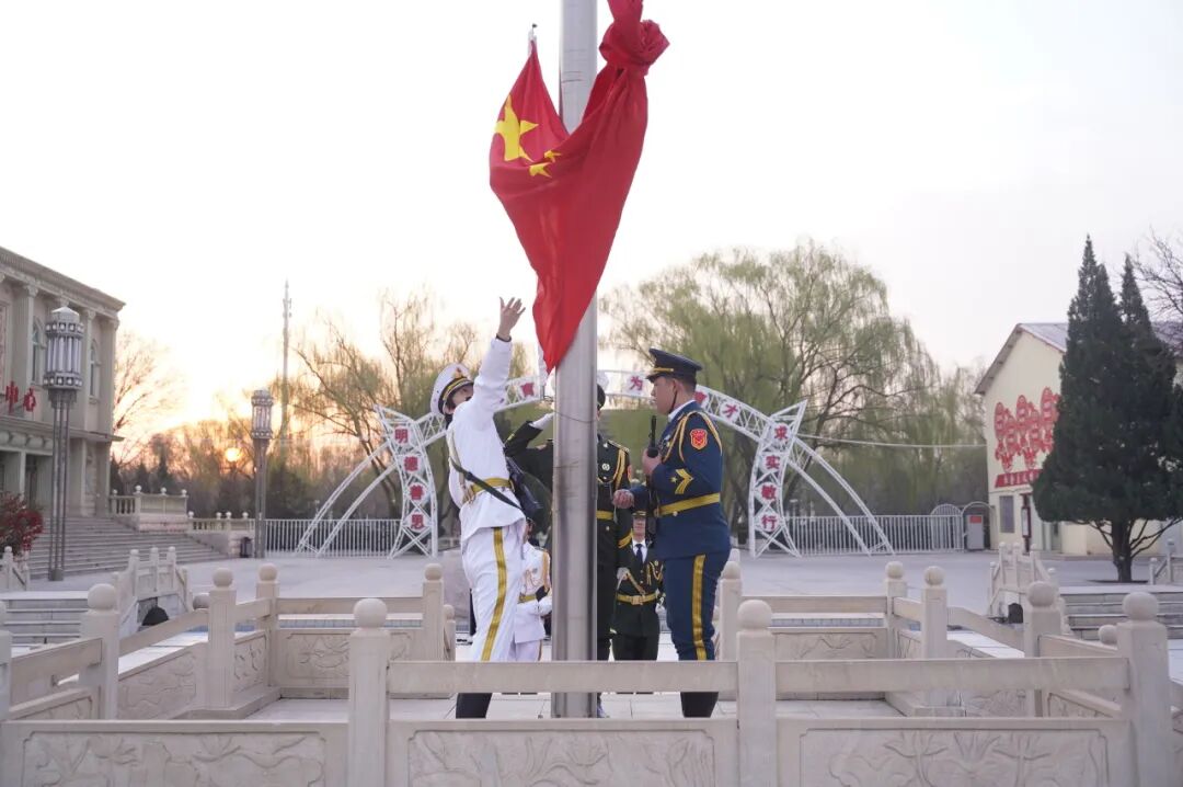 上午7时,校国旗护卫队着装笔挺国护服,肩扛五星红旗,步伐整齐,靴声铿锵。每一步都踏得坚定有力,红旗在臂弯间微微起伏,金色流苏随节奏合拍。国歌响起,擎旗手振臂展旗,五星红旗如火焰腾跃。全体师生肃然伫立,学生们身姿挺拔,老师们神情庄重,旗帜升至杆顶,朝阳的暖光里,家国的温情与期许静静流淌。