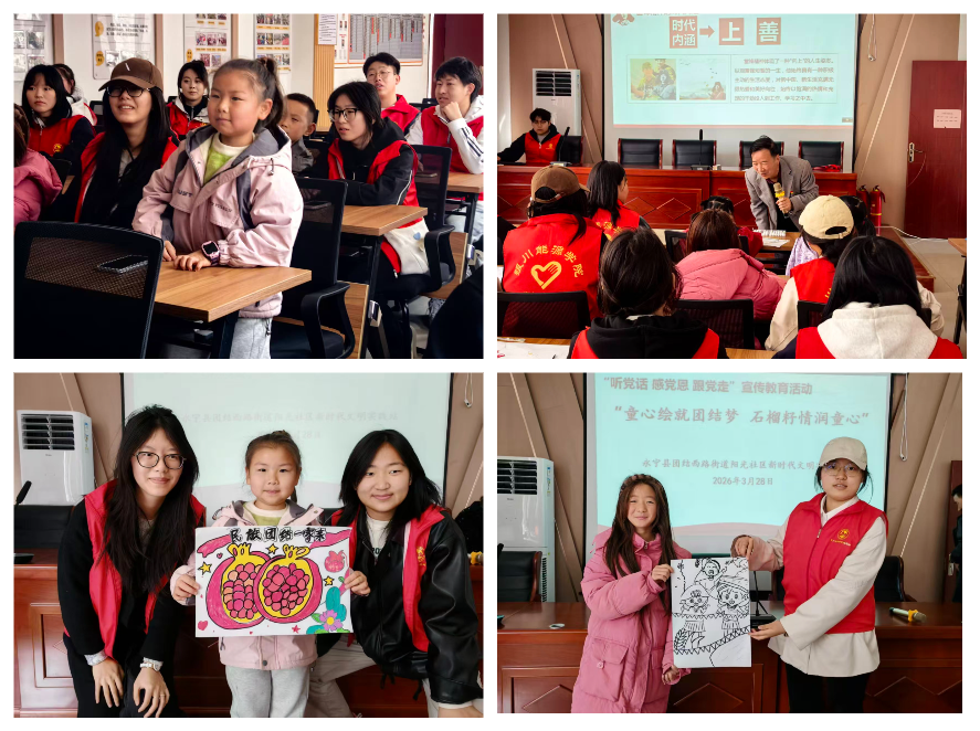 第一组学员走进永宁县团结西路街道阳光社区,围绕“学习雷锋精神,共筑民族团结”主题,开展了“童心绘就团结梦,石榴籽情润童心”特色活动。活动现场,志愿者们与社区各族青少年亲切互动,通过生动讲解向孩子们传递雷锋精神的时代内涵,引导大家从小树立互助友爱、奉献社会的价值理念。在绘画环节中,志愿者们耐心指导孩子们用画笔描绘“民族团结一家亲”的美好场景,孩子们以色彩斑斓的作品表达对各民族守望相助、同心筑梦的美好向往。此外,志愿者们还结合手机里的民族团结主题素材,为孩子们讲解各民族交往交流交融的故事,让“石榴籽”理念在童心深处扎根。此次活动不仅丰富了社区青少年的精神文化生活,更以寓教于乐的方式,将雷锋精神与民族团结进步教育有机融合,展现了青年学子服务基层、传递温暖的青春风采。