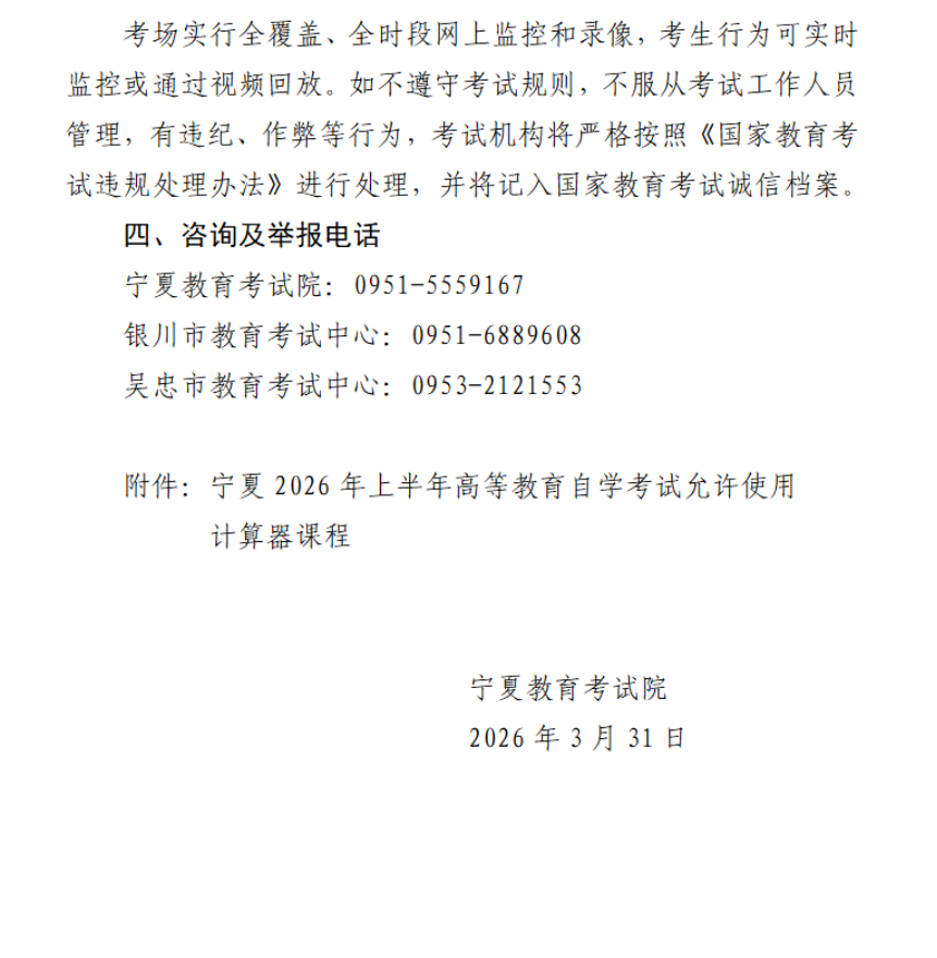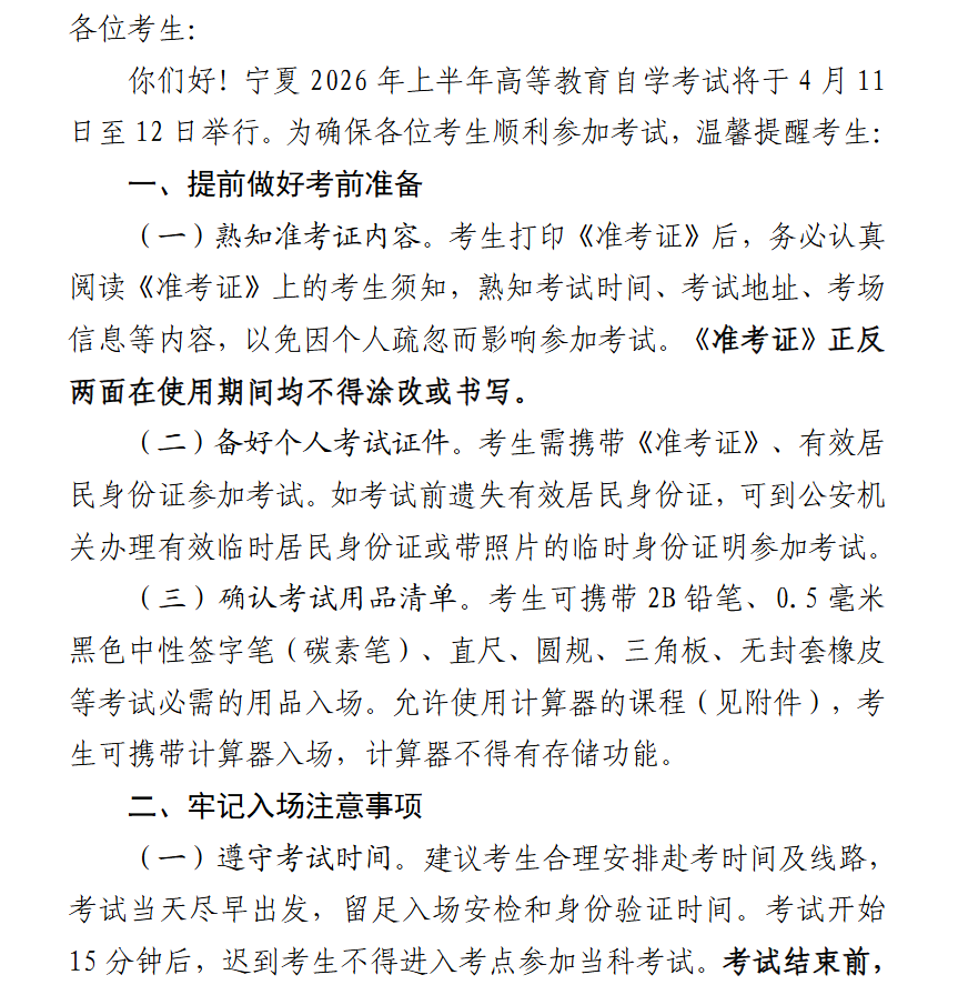 宁夏2026年上半年高等教育自学考试考前温馨提示