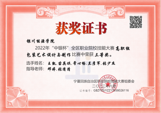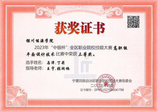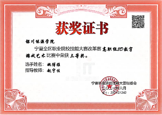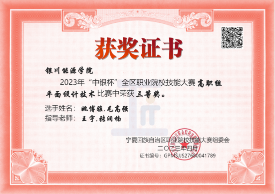 2、教学成果:积极组织学生参加学科竞赛、创新创业活动、技能大赛等活动,培养学生的创新精神与实践能力。近五年多次获得全区职业技能大赛多个赛项的奖项,其中,一等奖2项,二等奖13项,三等奖41项;第十三届大广赛宁夏赛区三等奖1项,优秀奖多项,蓝桥杯全国软件和信息技术专业人才大赛(国赛)软件类三等奖2项,省赛一等奖2项,二等奖2项;全国大学生计算机应用能力与数字素养大赛暨第六届传智杯全国IT技能大赛专业信息技术一等奖1项,二等奖1项,计算机能力挑战赛国赛二等奖1项,省赛一等奖1项,二等奖4项,三等奖3项;全国大学生数字编辑创新大赛优秀奖1项;学生积极参加大学生创新创业训练计划项目,多次获得校级比赛奖项。同时,学生积极考取各类职业资格证书,成效显著,包括全国计算机等级考试证书、普通话水平测试等级证书、工业和信息化人才岗位能力认证证书、CEAC职业技能证书、民用无人驾驶航空器操控员等,为就业竞争力增添重要砝码。