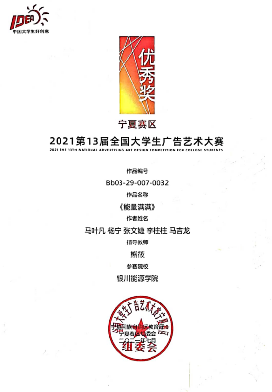 积极组织学生参加各级各类学科竞赛、创新创业活动、课外兴趣小组、技能大赛等活动,培养学生的创新精神与实践能力。学生参加“大学生创新创业训练项目”立项国家级项目2项、自治区级项目3项。参加“全国大学生广告大赛”“蓝桥杯全国高校视觉艺术设计赛”“中国好创意暨全国数字艺术设计大赛”“未来设计师全国高校数字艺术设计大赛”“中银杯全区职业院校技能大赛”等学科竞赛摘得优秀成果,近几年在国家级、省(部)级学科竞赛斩获一、二、三等奖若干,成果丰硕。
