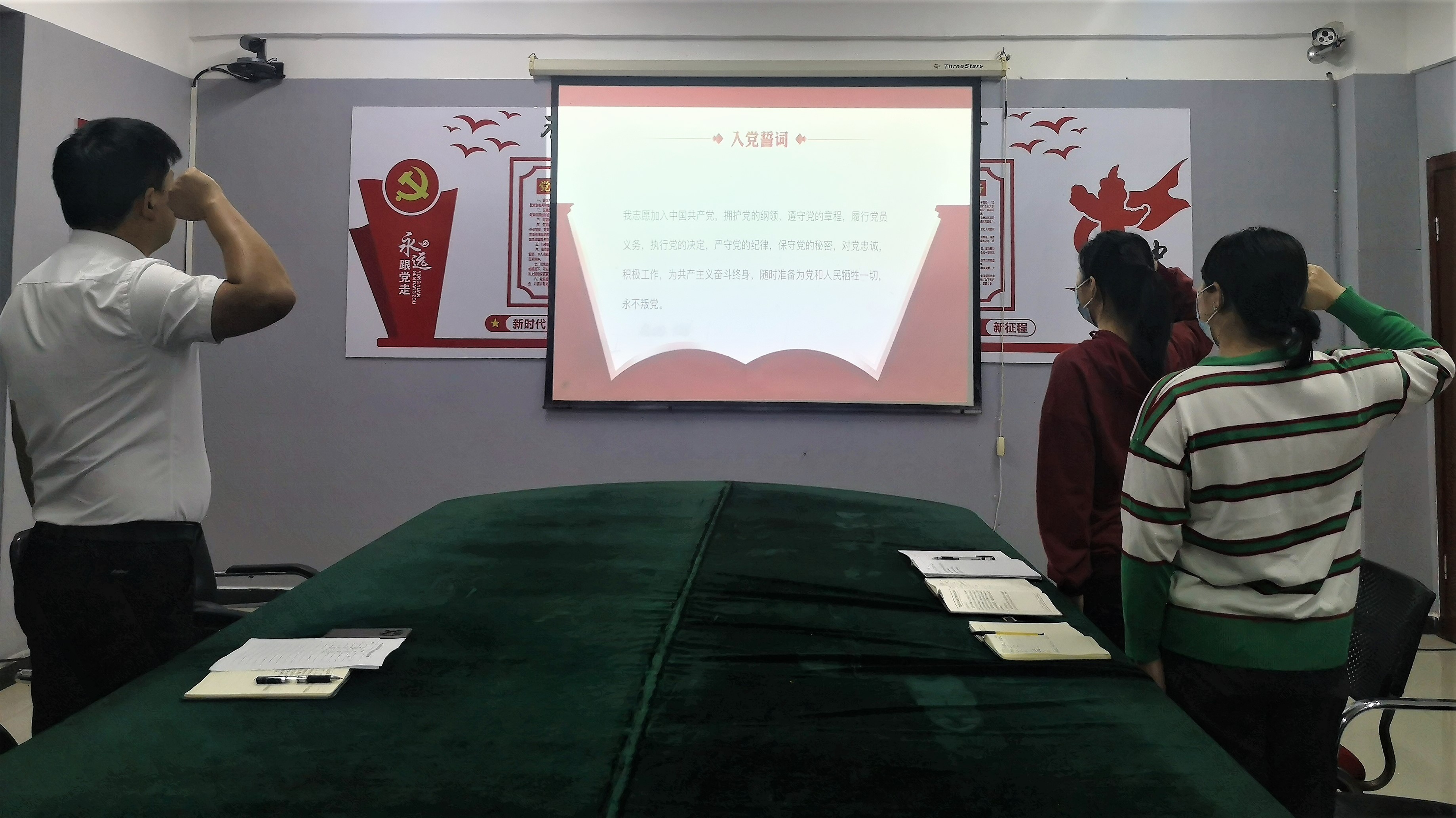 •重温入党誓词,全体党员佩戴党徽,面向鲜红的党旗,举起右拳,庄严宣誓。铿锵有力的誓言直击人心,让大家铭记党的宗旨,履行党的义务,坚定理想信念。