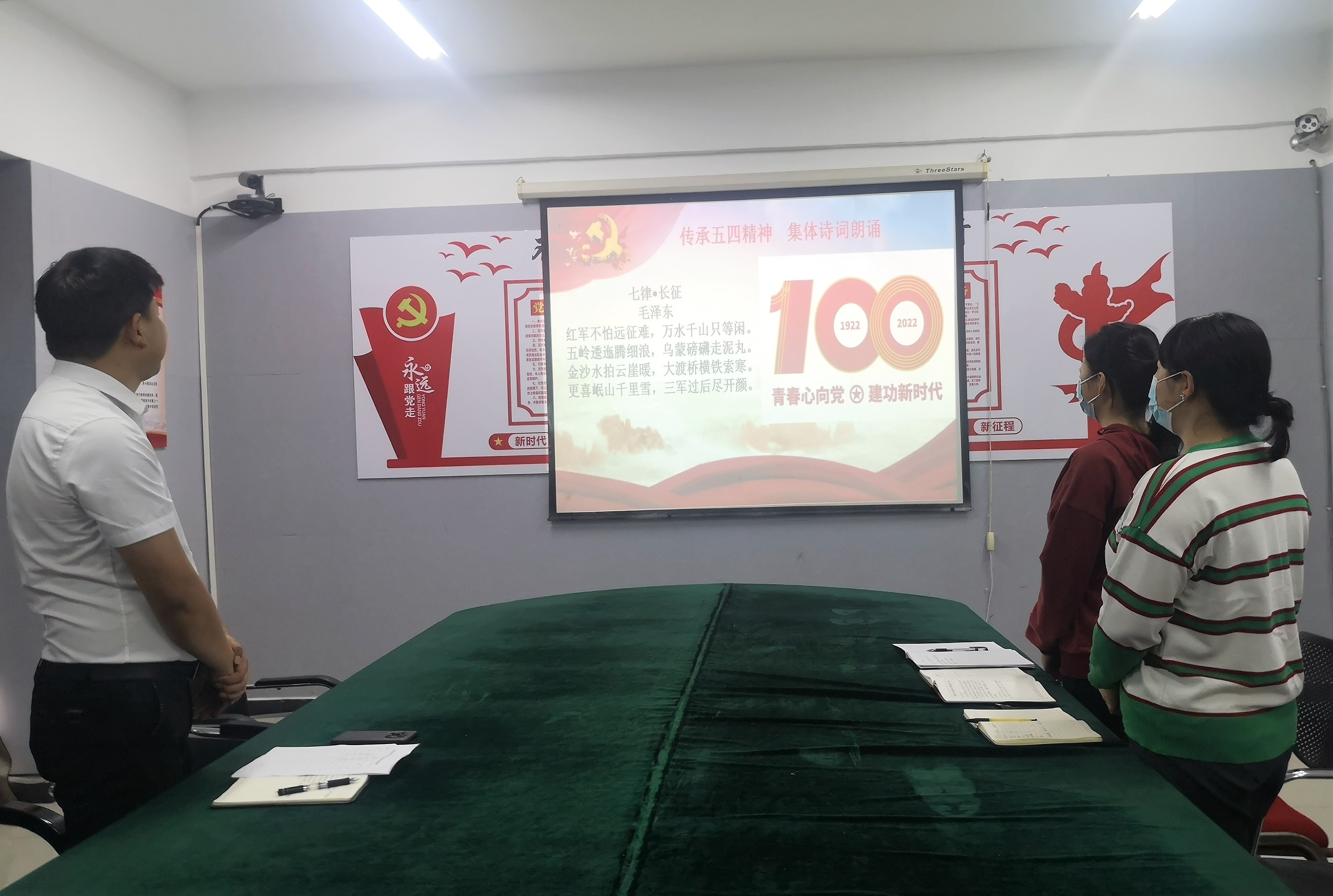 •开展诗词朗诵活动,集体朗诵毛泽东《七律•长征》,传承五四精神。对青年人提出的要立足新时代新征程,坚定不移听党话、跟党走,努力成长为堪当民族复兴重任的时代新人的谆谆教诲和殷切希望。