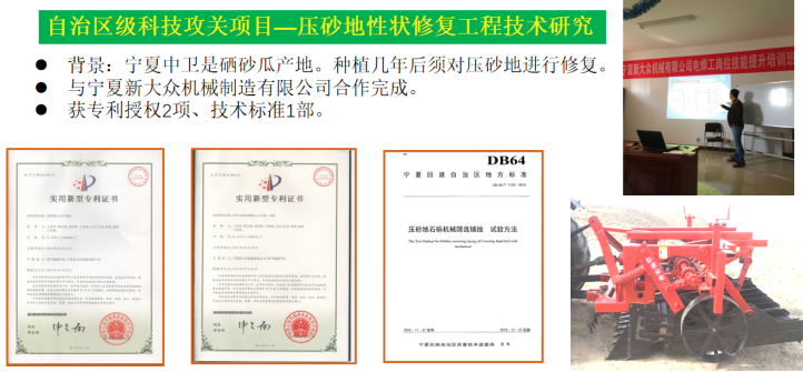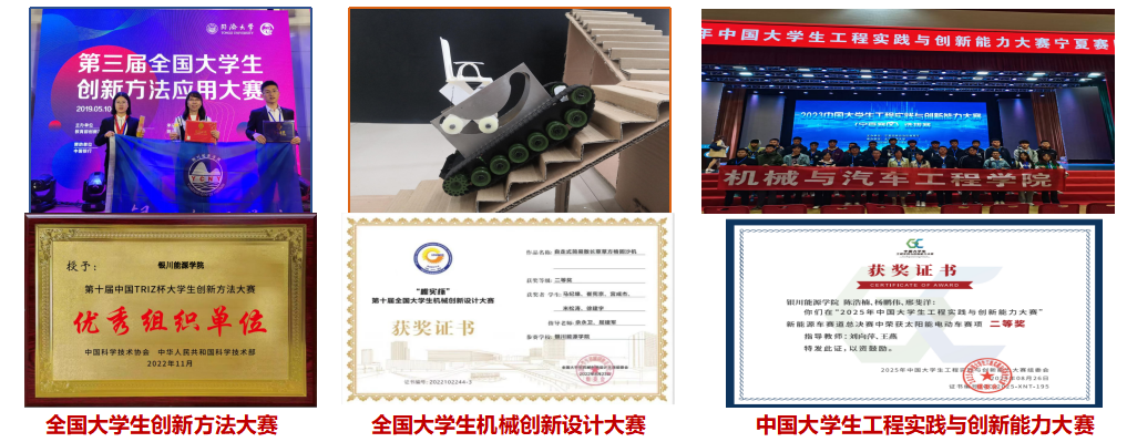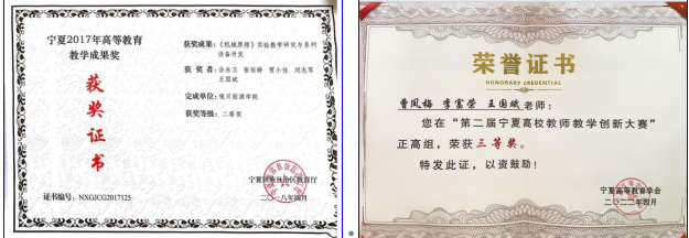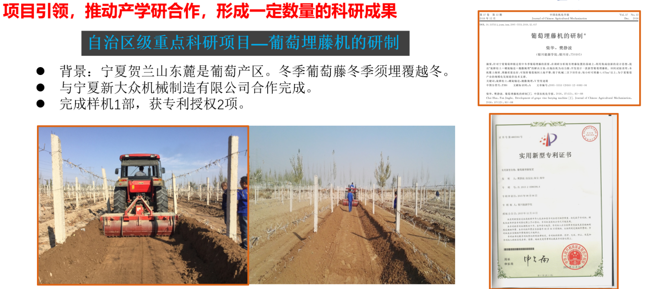 专业联合西北骏马电机股份公司开展“矿用大功率防爆电机机壳变形研究”“电机拆装工艺研究”“电机轴电流消除装置设计”“底座式全方位液压钻机设计”等。以项目为依托,指导学生完成国家大学生创新训练项目1项、宁夏区级大学生创新训练项目4项,发表论文10余篇;与宁夏新大众机械制造有限公司共同完成区级重点科研项目“葡萄埋藤机的研制”和宁夏高校服务地方社会经济发展项目“吴忠地区规模养殖饲料加工机械化技术项目瓶颈问题调查与改进研究”,获得发明专利3项、技术标准1部,其中《压砂地石砾机械筛选铺放试验方法》(DB64/T 1123-2015)地方标准项目经宁夏自治区质量技术监督局于2015年12月27日批准发布实施。