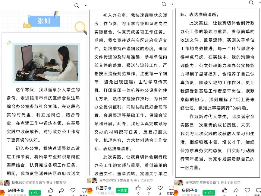 “纸上得来终觉浅,绝知此事要躬行。”这个寒假,我以返家乡大学生的身份,走进银川市兴庆区综合执法局开展社会实践。在基层岗位的点滴历练中,我锤炼过硬本领、感悟责任担当,更深刻读懂了实践对青年成长的重要意义。这份实践心得也有幸登上“庆团子”微信公众号,成为我扎根基层、践行初心的珍贵见证。