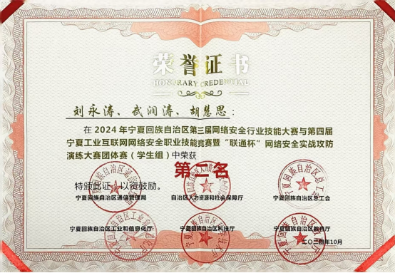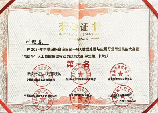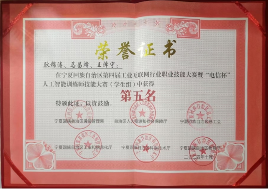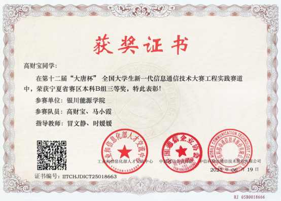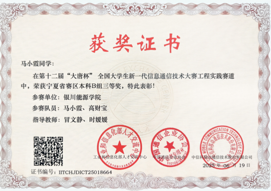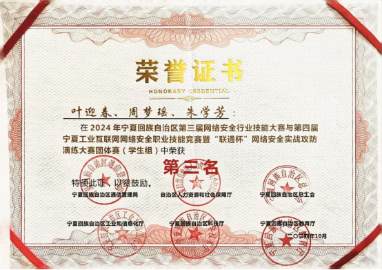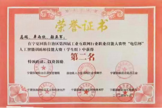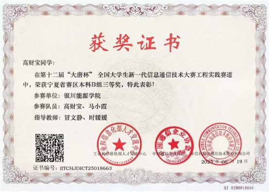 学生获得各类自治区级竞赛奖40人次,其中国家级全国大学生数学建模竞赛二等奖一项,全国高校计算机能力挑战赛西北赛区三等奖一项、优秀奖二项,蓝桥杯全国软件和信息技术专业人才大赛二等奖和三等奖各一项,宁夏第六届大学生数学建模大赛三等奖三项,“挑战杯”大学生创业计划竞赛金奖和银奖各一项,2022年全区工业互联网安全和大数据分析技能竞赛二等奖和三等奖各一项,蓝桥杯全国软件和信息技术专业人才大赛三等奖一项,第九届“大唐杯”全国大学生移动通信5G技术大赛二等奖二项,云计算技术与应用全区职业技术大赛一等奖一项,宁夏第六届大学生数学建模大赛三等奖一项第九届“大唐杯”全国大学生移动通信5G技术大赛二等奖一项。