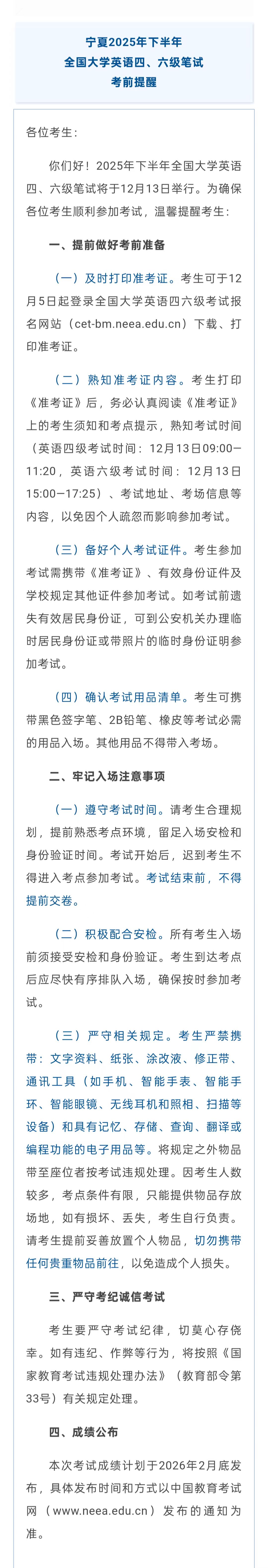 宁夏2025年下半年全国大学英语四、六级笔试考前提醒