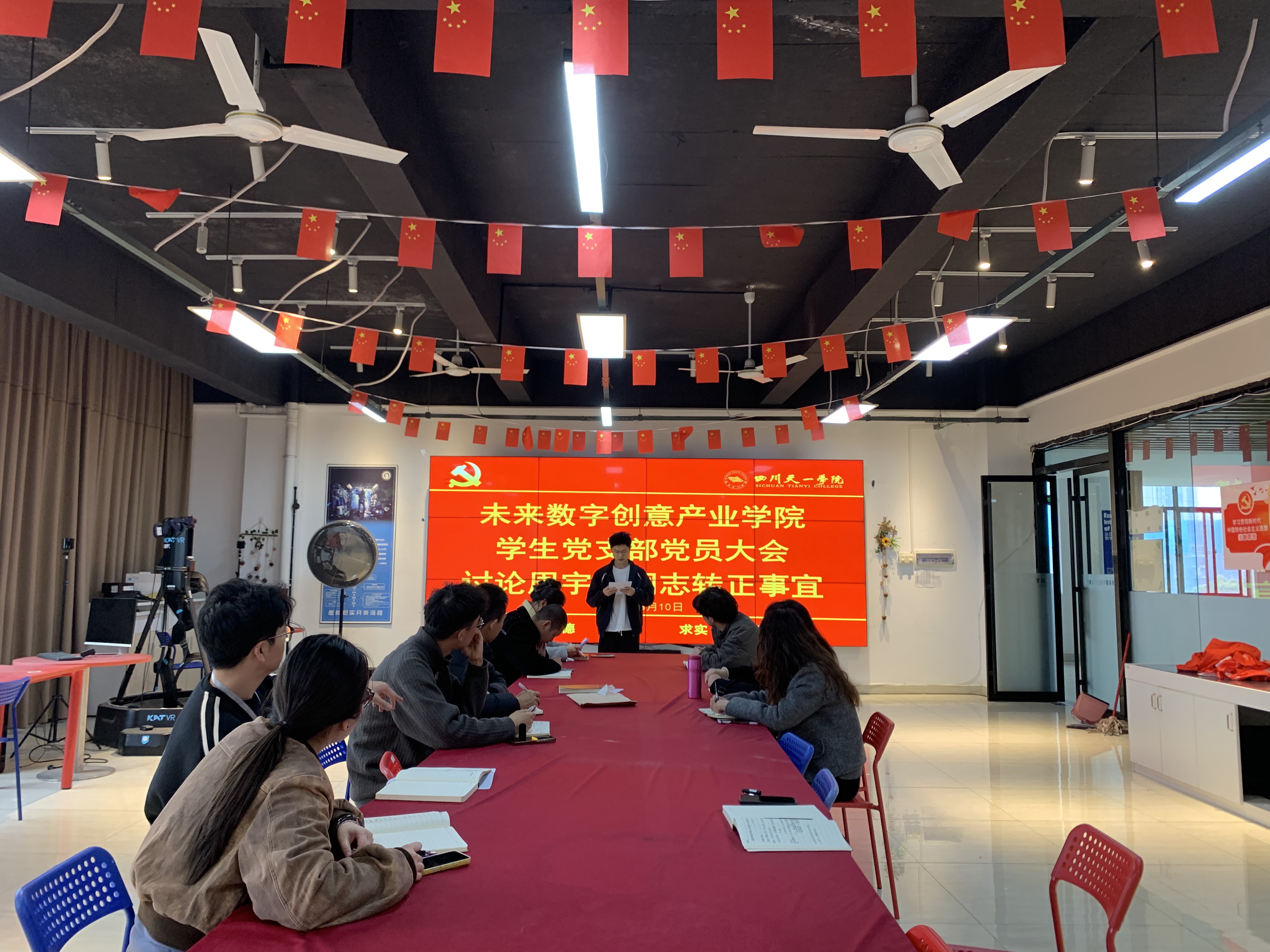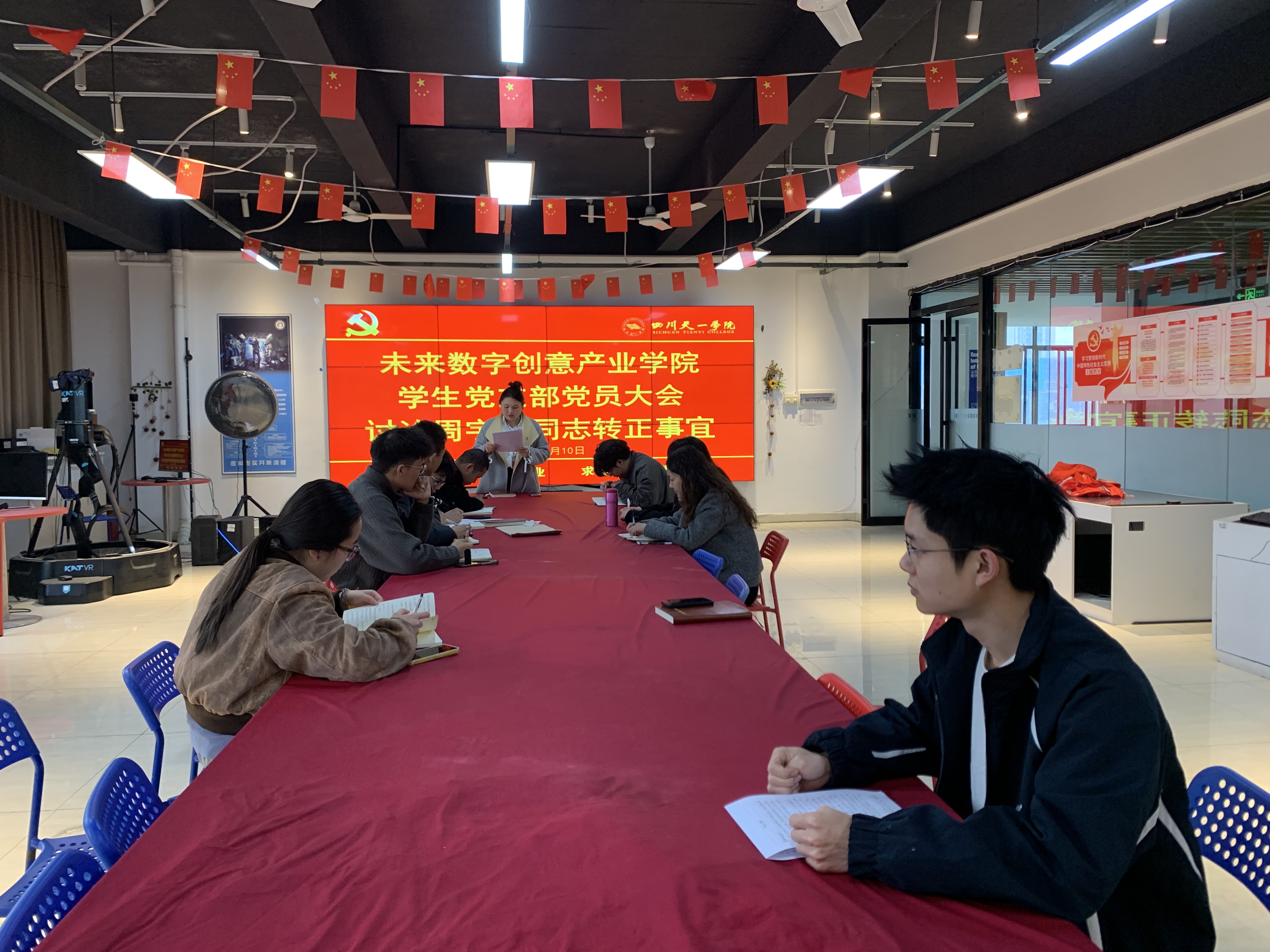 为严格党员发展程序,加强党员队伍建设,2026年3月12日,未来数字创意产业学院学生党支部在知行楼416会议室召开党员大会,专题讨论周宇杰同志预备党员转正事宜。党支部全体党员参会,学院组织部邱天老师列席,会议由学生党支部书记饶倩主持。会议开始后,饶倩介绍了到场人员及会议议题,强调了会议纪律。随后,周宇杰同志上台汇报预备期间的思想、学习、工作情况,剖析自身不足,明确改进方向,并郑重提出转正申请。