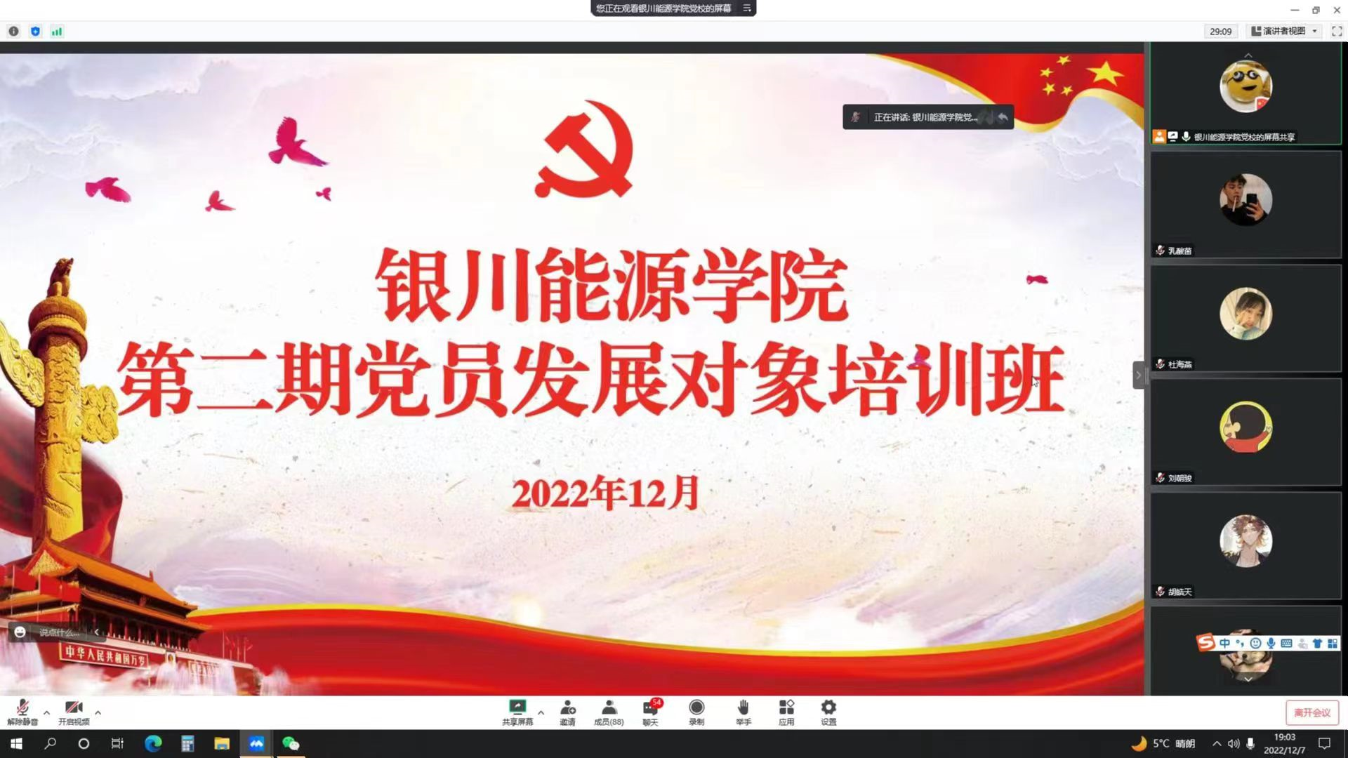 为深入学习宣传贯彻党的二十大精神,做好新形势下的发展党员工作,切实提高党员发展对象的政治理论素养,学校党校结合互联网教学优势,创新疫情防控时期党员发展对象教育培训方式,搭建"线上平台",充分发挥党建"互联网+"优势,12月7日晚,银川能源学院第二期党员发展对象培训班在"云端"顺利开...