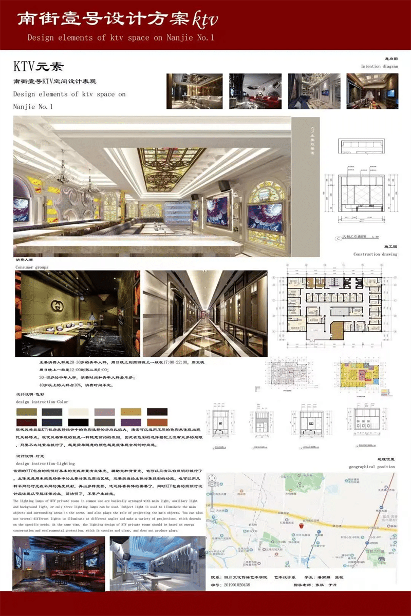 设计说明:随着人们生活水平、消费水平的提高,消费习惯也随之改变,外出娱乐的方式也多种多样,人们不仅开始重视娱乐内容,更加注重娱乐场所的休闲性、自主性,即希望玩的愉快轻松,可以完全的释放自己。本设计为量贩式KTV,主要利用墙面,灯光,吊顶,地面等装饰,通过外在的界面形式感和内在的结构装饰统一布局,营造一种独特的个性风格和鲜明的主题特征,为客户提供愉快的休闲环境。