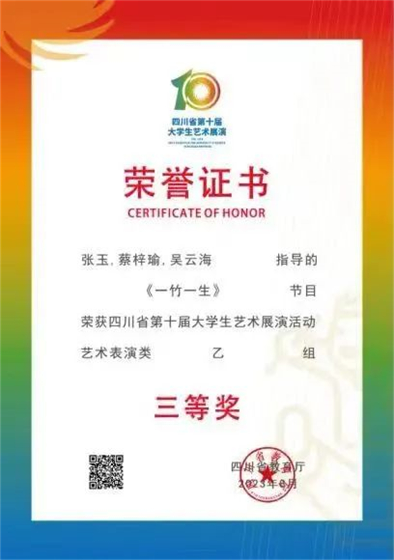 2023年原创舞蹈《一竹一生》获四川省大学生艺术节三等奖。