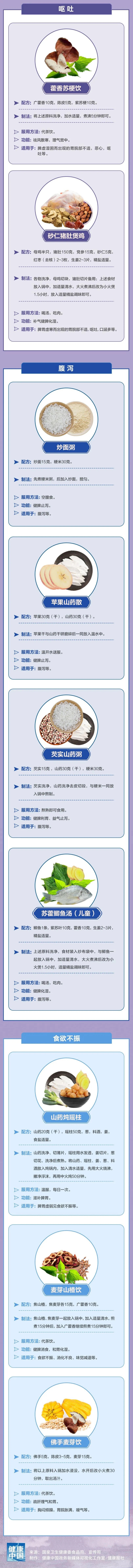 呕吐的患者可尝试藿香苏梗饮、砂仁猪肚煲鸡;腹泻患者可尝试炒面粥、苹果山药散、芡实山药粥等;食欲不振的患者可尝试山药炖瑶柱、麦芽山楂饮等。往下看,了解制作和服用方法↓
