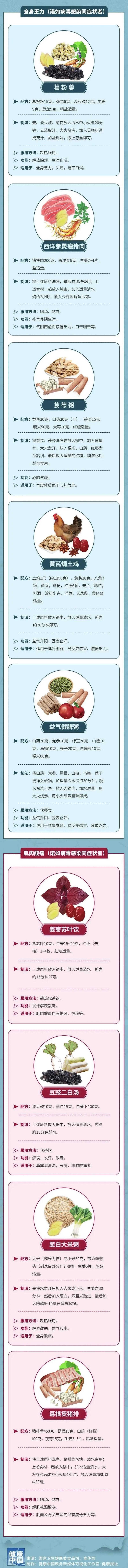 全身乏力的患者可尝试葛粉羹、西洋参煲瘦猪肉、芪苓粥等;肌肉酸痛的患者可尝试姜枣苏叶饮、豆豉二白汤、葱白大米粥等。往下看,了解制作和服用方法↓
