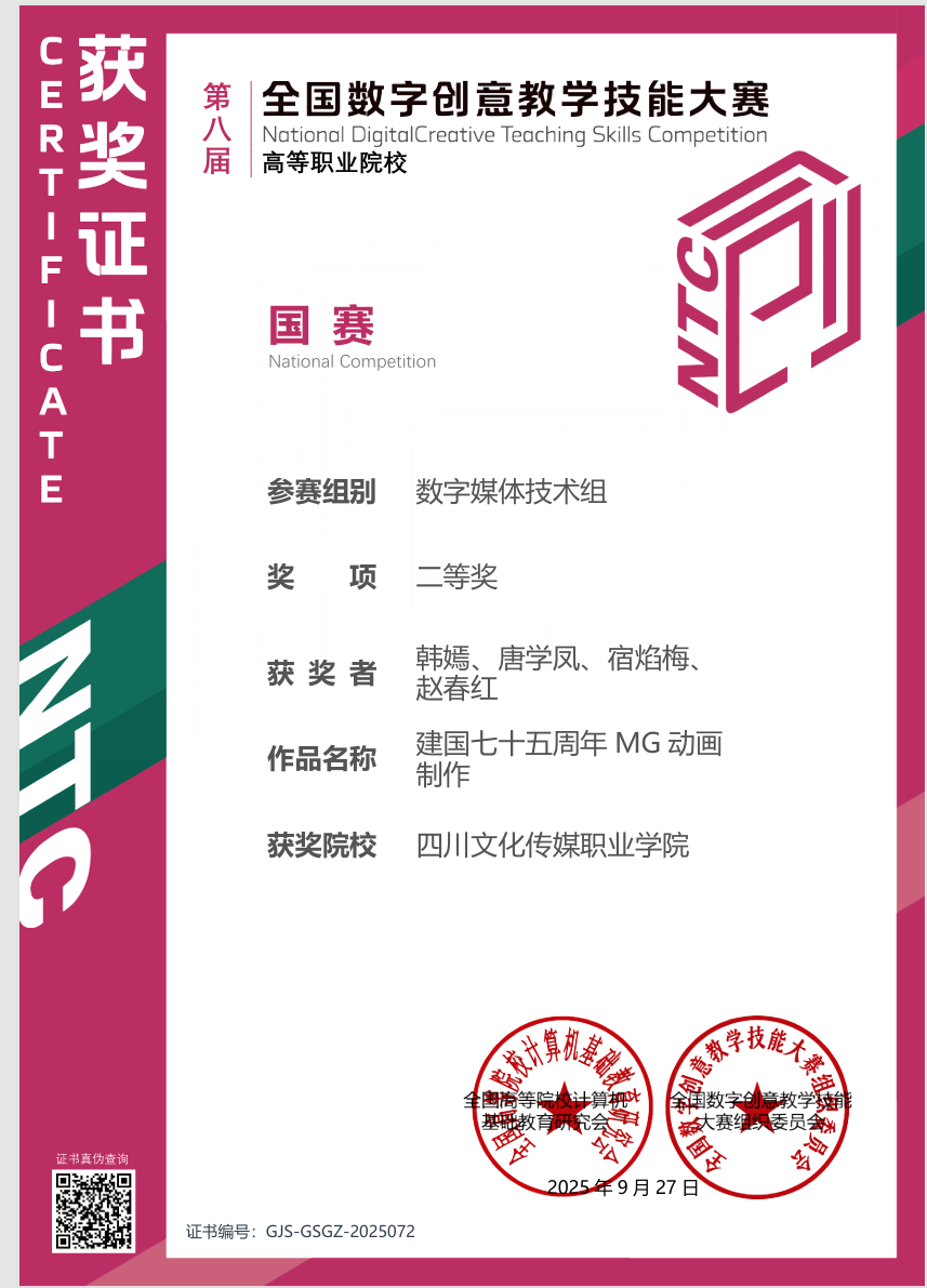 最终,团队凭借作品《建国七十五周年MG动画制作》,在众多优秀作品里脱颖而出,成功斩获国赛二等奖的桂冠。。