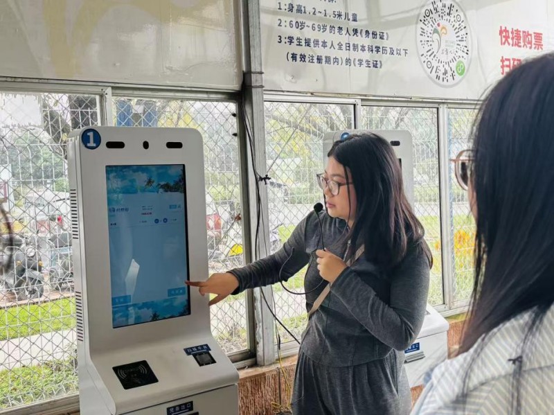 10月15日,学生以小组形式深入景区各个服务环节。在游客中心,他们认真学习咨询接待、投诉处理、行程规划等标准化服务流程,切身感受“以游客为中心”的服务理念。指导教师张田田重点演示了电子售票系统的操作流程,让同学们直观体会到科技为文旅管理带来的革新。