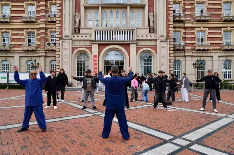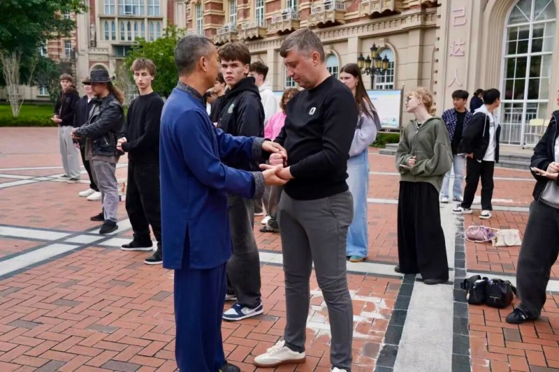 随后,体育产业学院打造的“太极大师体验课”成为全场焦点。和式太极拳第七代传人韩利星老师和助教梁跃进老师先以行云流水的招式,演示太极“以柔克刚”的独特哲学,引得在场嘉宾连连称奇;接着手把手指导白俄罗斯学生调整呼吸、规范动作——从“云手”到“单鞭”,外国学子认真模仿每一个细节,在肢体舒展间,真切触摸到中华传统体育的深层魅力。