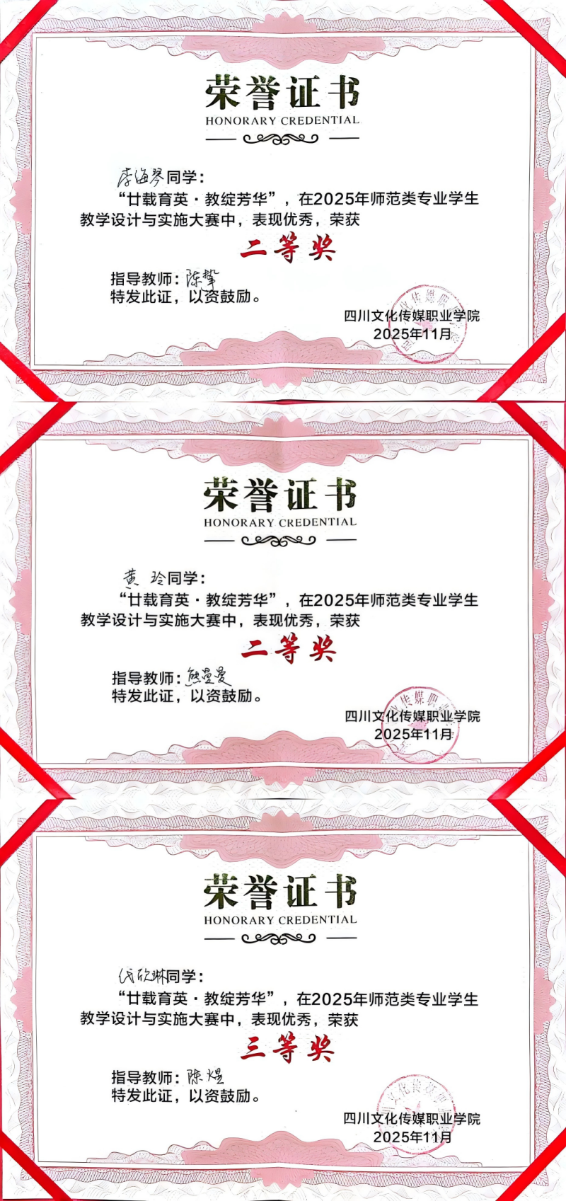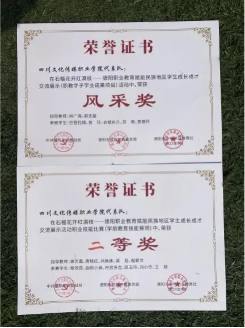 5、2025年9月25日德阳职业教育赋能民族地区学生成长成才交流展示活动,学前教育学院6名学生参加学前技能竞赛,通过说课、舞蹈、儿歌弹唱、手工制作、幼儿故事等五场激烈比拼,最终获得二等奖(第二名),美术团队进行作品展示,被评为“风采奖”
