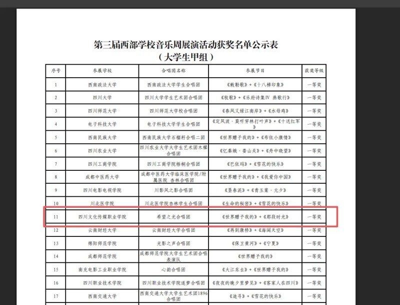 2、第三届西部学校音乐周展演活动大学生甲组一等奖