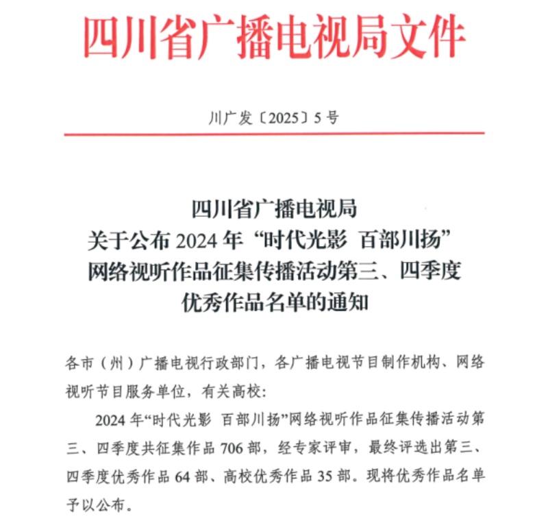 四川文化传媒职业学院报送11部作品成功入围2024年"时代光影 百部川扬"网络视听作品征集传播活动