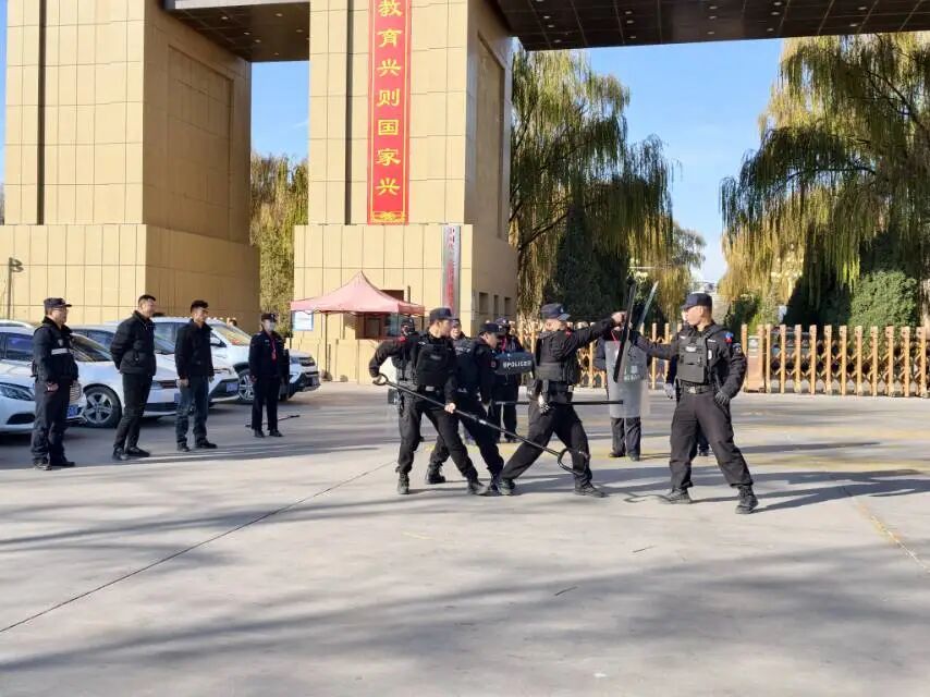 演练模拟持刀人员欲从东门闯入,门岗安保人员迅速关闭校门、启动一键报警,并呼叫巡逻人员支援。6名安保人员组成两组“盾棍叉”防暴小组,协同制约“歹徒”,为特警到场争取时间。