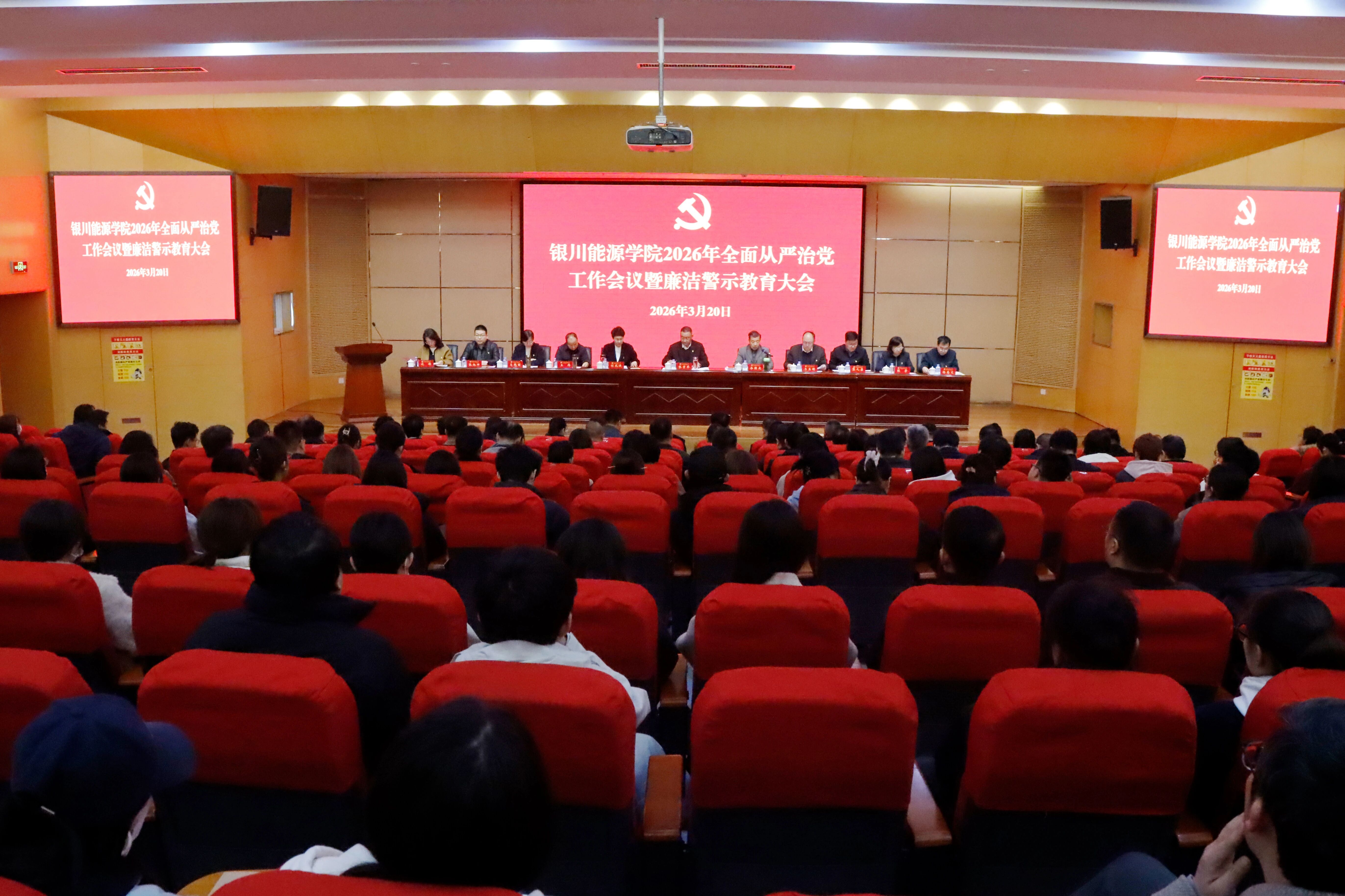 3月20日,银川能源学院召开2026年全面从严治党工作会议暨廉洁警示教育大会,深入学习贯彻习近平总书记在中央纪委五次全会上的重要讲话精神,全面落实中央纪委五次全会、自治区纪委十三届五次全会、全国和全区教育系统全面从严治党工作会议部署要求,总结2025年全面从严治党和党风廉洁建设工作,研究部署2026年重点工作任务。学校党委书记张学举出席会议并讲话,党委副书记、执行校长谷朝众主持会议,校党委班子成员出席会议。
