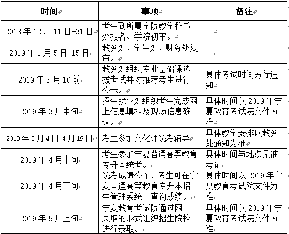 根据《2012年宁夏普通高等教育专科升本科招生考试工作实施办法》(宁教考院成招〔2011〕128号)和《关于做好2018年全区普通高等教育专科升本科招生报名与考试工作有关问题的通知》(宁教考院〔2018〕26号)精神,现将我校2019年全区普通高等教育专科升本科报名考试工作相关事宜通知如下: