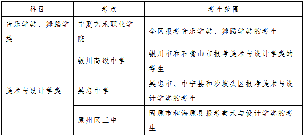 音乐学类和舞蹈学类的考生可于12月20日下午到宁夏艺术职业学院考点,美术与设计学类的考生可于12月23日下午到相应考点查看考场安排、考试注意事项、面试时间安排等。